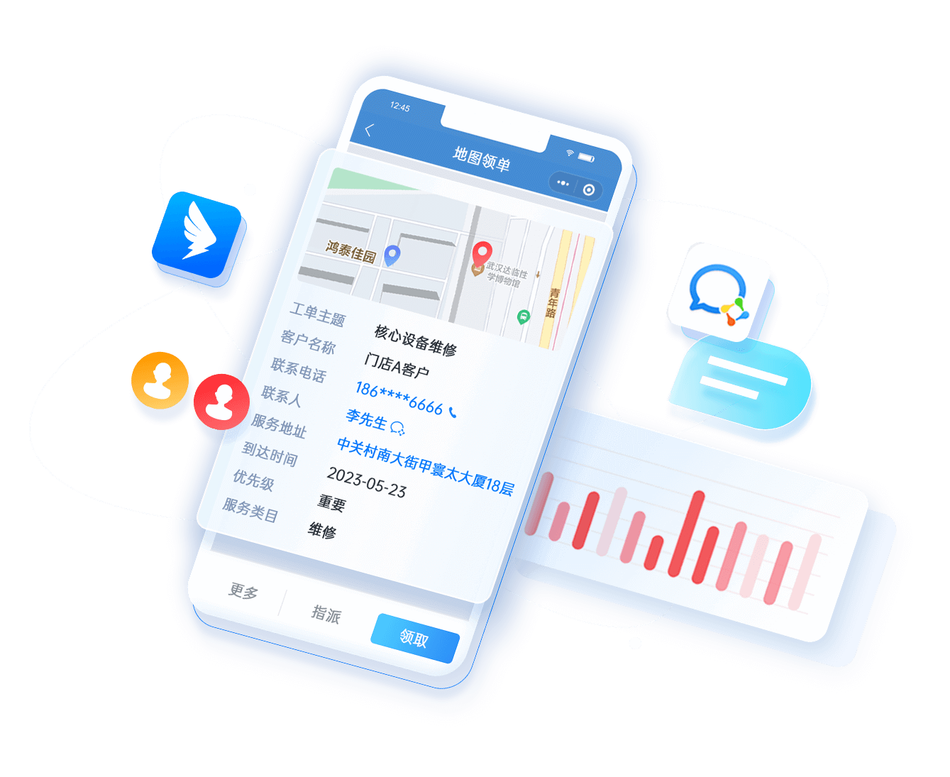 1、電話轉工單受理,通過來電彈屏發(fā)起維修工單,通過區域路由將工單指派到地區負責人